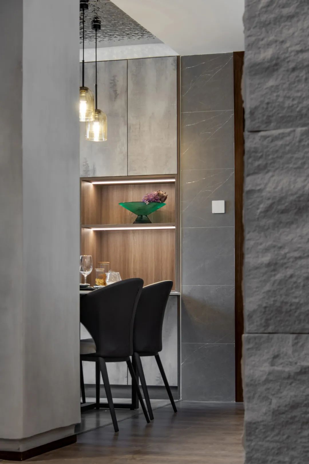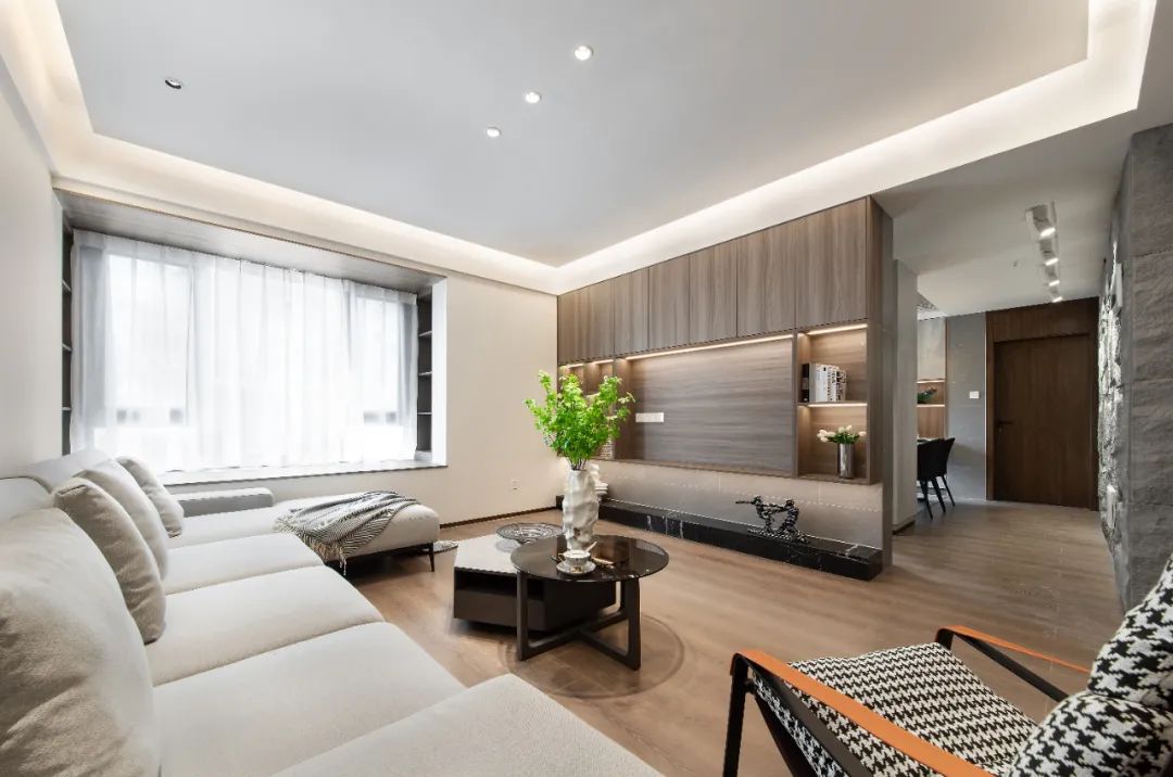 整體雖簡約,但不簡單,墻面運用藝術高仿石材裝飾,紋理質感強,光影效果好;懸浮電視柜用格調裝飾獨有工藝固定,穩(wěn)定性佳,也減少地面衛(wèi)生死角,減輕家務疲憊;而無主燈設計極簡造型的背后,是復雜卻有序的水電規(guī)劃,和極其繁瑣的工藝。
