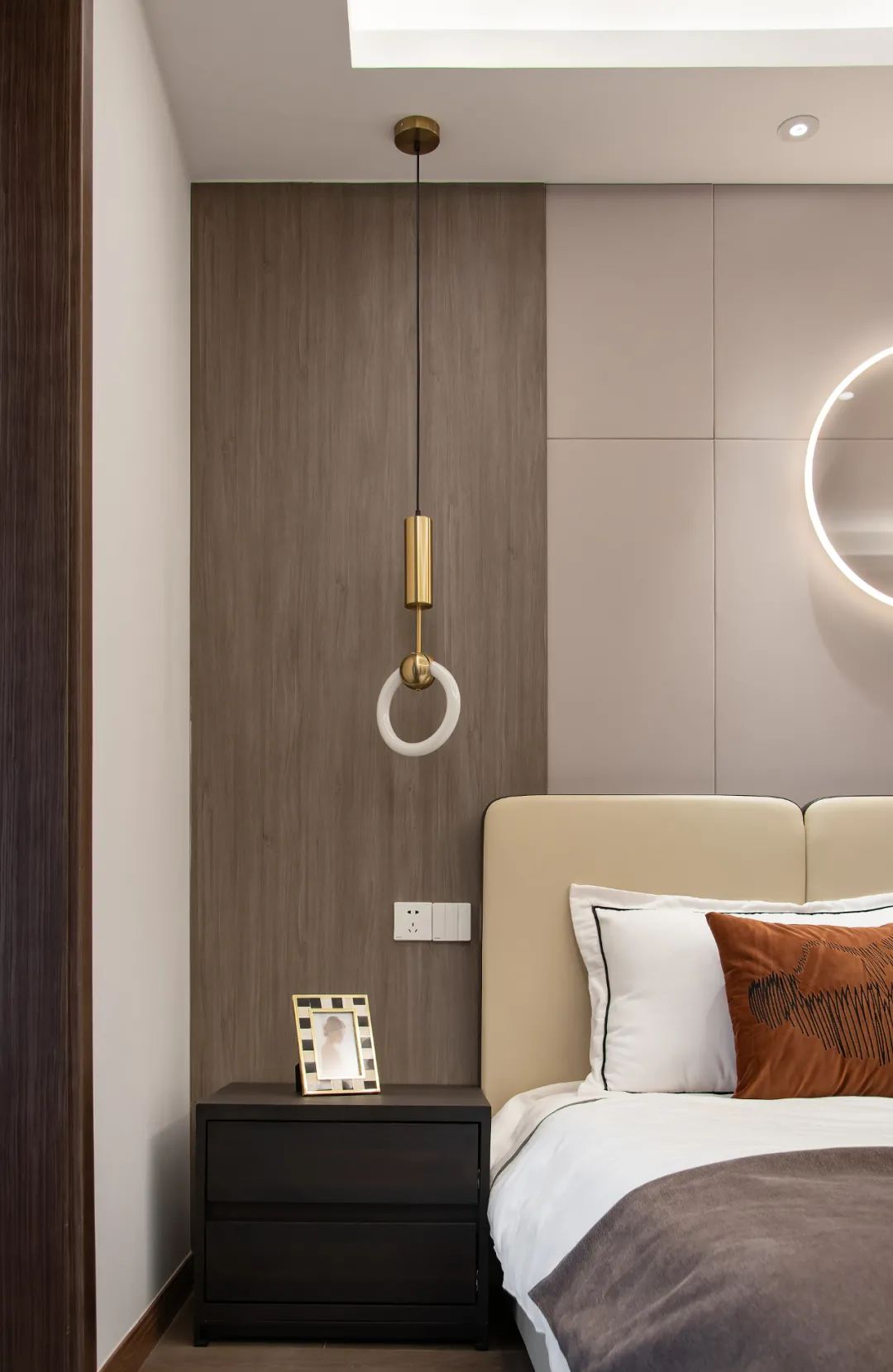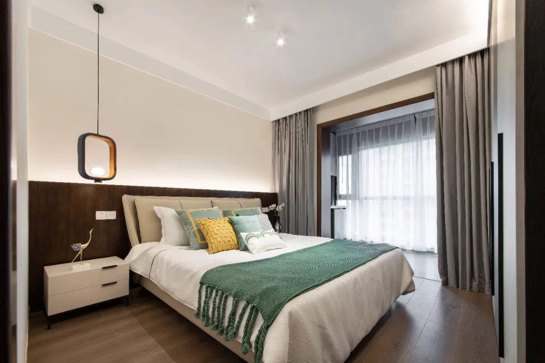 主臥用木紋、白、灰三色將整體空間串聯(lián)起來,保持全屋的統(tǒng)一基調;分色墻組合燈線,增添空間層次感的同時,又給了臥室獨有的小心機。